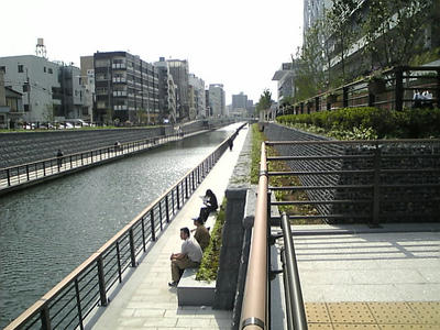 スカイツリーのすぐ脇を流れている川、護岸をすっかり綺麗にして遊歩道になっています。