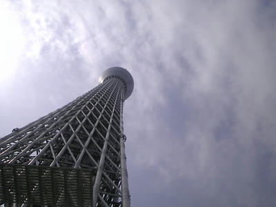 この遊歩道から見上げるスカイツリー、真下から見上げる感じです。