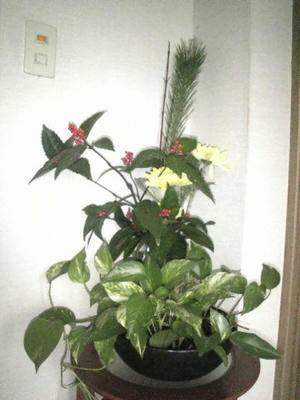 お正月の花、カミさんが活け替えて再利用。