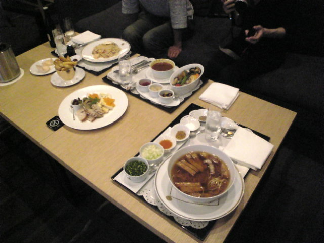 パーコー麺、インドネシア風フライドライス、野菜をあしらったスープカレー、それにチーズの盛り合わせとフライドポテト。