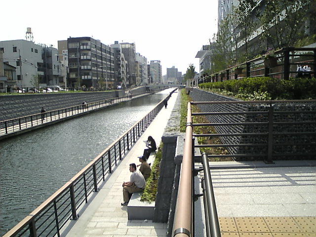 スカイツリーのすぐ脇を流れている川、護岸をすっかり綺麗にして遊歩道になっています。