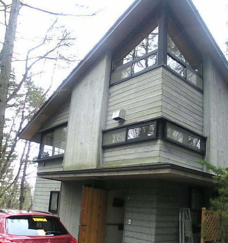 諏訪湖の先、長野自動車道岡谷インターからすぐの静かな森の中に建つ、なかなか素敵な山荘です。