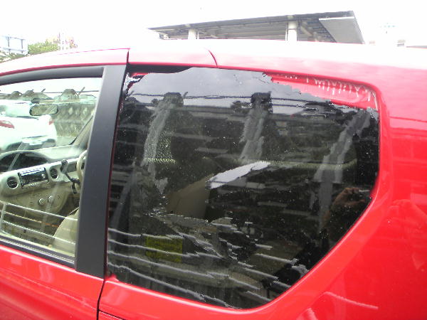 何事かと思って見まわすと、なんと左後ろの窓ガラス全面にひびが!!