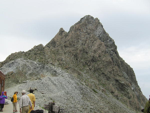 槍ヶ岳山荘前のテラスからの槍の穂先
