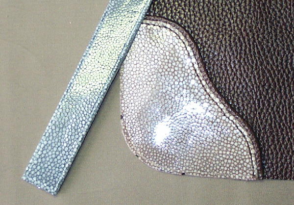 右側の茶色いものは濃茶色の牛革の胴判で、下の角に飾りとして「エイの皮」を付けているわけです。
